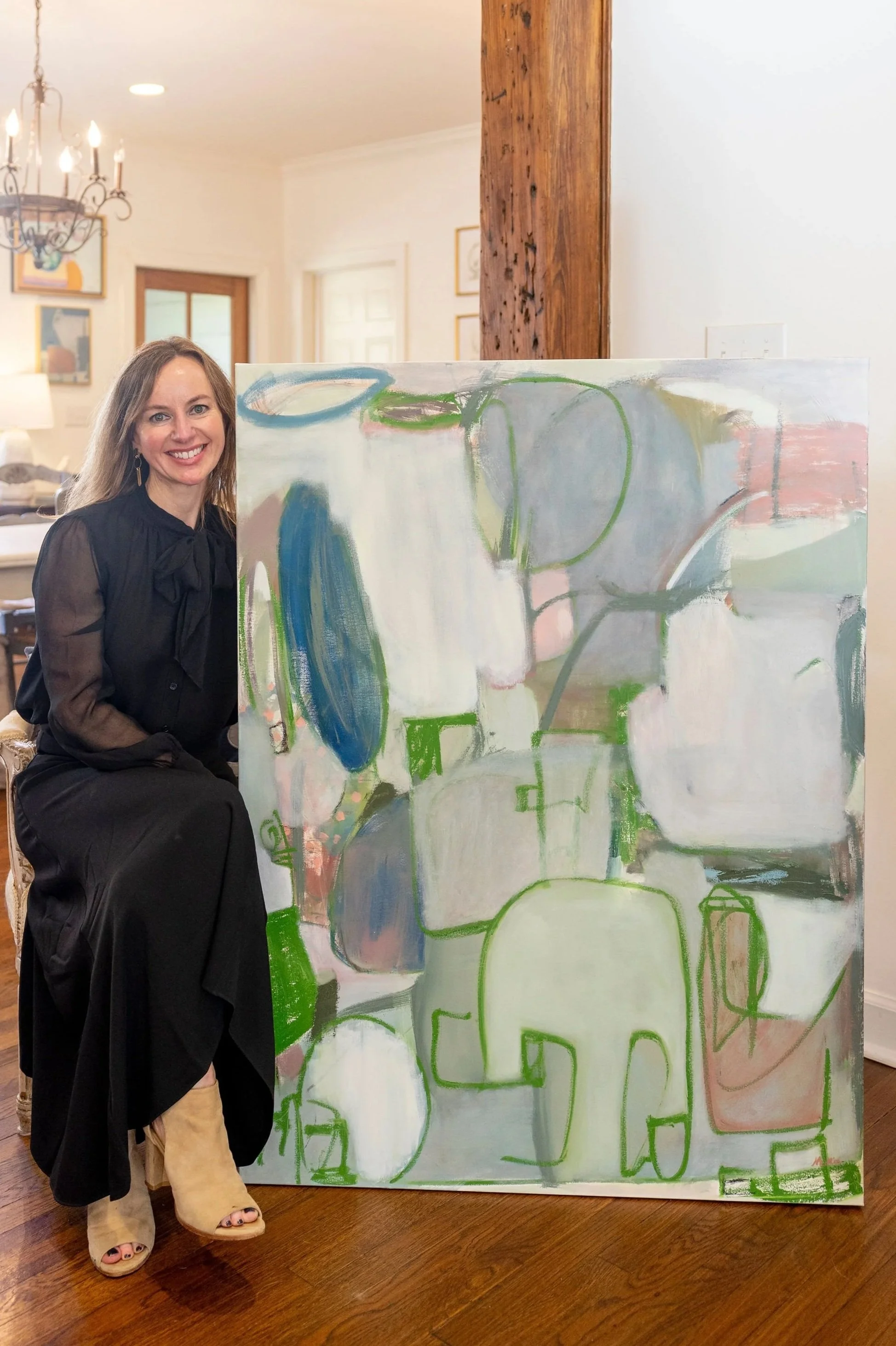 I am inspired by Parision interiors and feel my works live perfectly in settings like those — a blend of antique and modern, soft curved lines of antique furniture or molding juxtaposed with contemporary strokes of bold art. There is a beautiful balance that happens, and the result is a collected feel of refinement.”